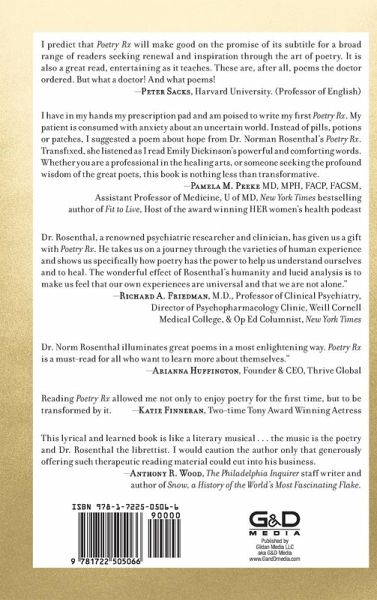 POETRY TO HEAL, INSPIRE AND BRING YOU JOY PoetryRx presents 50 great poems as seen through the eyes of this renowned psychiatrist and New York Times bestseller. In a tour de force that spans four centuries, Dr. Norman E. Rosenthal shows how these poems can help the modern reader to lead a healthier, richer and more enjoyable life. In addition, Rosenthal illustrates the psychological insights revealed in these literary gems, from the sonnets of Shakespeare to the masterpieces of modern verse. The book will deal with fundamental psychological issues that we all face as we try and live our best lives, ranging from loving and losing; responses to nature; aspects of the human experience; the search for meaning; and aging. Never before have we had a tour by such a knowledgeable guide through great poetry which can, heal, inspire and bring joy to our lives. Dr. Norman E. Rosenthal is a world-renowned psychiatrist, public speaker, and best-selling author known for his innovative research and inspirational writings. A clinical professor of psychiatry at Georgetown University of Medicine, he is the researcher who first described seasonal affective disorder and pioneered the use of light therapy. He is listed as one of the best doctors in American and has practiced psychiatry for over four decades, treating people with all manner of psychiatric and emotional health issues.