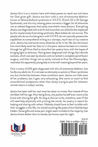 Jessica Ann is on a mission here with these poems to reach out and share her God-given gift. Jessica was born with a rare chromosome deletion known as Velocardiofacial syndrome or V.C.F.S. (Catch 22 or Di George Syndrome), and this tiny missing piece connects a bigger list of otherwise not as related diagnoses that easily overwhelm most doctors. Everything Jessica was diagnosed with at birth and since then can all be further explained by this mysteriously frustrating syndrome. Most babies do not survive. The people who do survive being born with V.C.F.S. do not naturally possess the capabilities to comprehend writing as a concept, much less to try creative work. Jessica has overcome many obstacles so far in her life, but she knows how more likely await her later on in the years. Jessica has been on a mission through her gift from God to share first her poetry here, with the hopes of bringing light to darkness. Having been diagnosed with things like infantile scoliosis, which was seen by doctors and corrected in complete spinal fusion surgery, and then things not as easily noticed at first like fibromyalgia, motivates this apparently young lady to write with meaning beyond her years. One in every 4,000 gets diagnosed with this chromosome deletion, but hardly any adults do. It is not seen as obviously as autism or Down syndrome are, but similarities between these conditions exist. Jessica can hide most of her problems, but it gets very exhausting. She wants so much to find unconditional acceptance rather than always trying to pass for whatever normal means in today's society. Jessica has been told her soul must be closer to ninety-five instead of how she feels half her age. Now being forty, she pushes herself even more to be brave with sharing her gift. As long as she can write, somehow, even if she will need help physically with printing the words, her poetry is meant for helping and sharing with others. Nobody should have to feel invisible with their struggles in this life, nor should anything like poetry from God be kept hidden. Some gifts and some pain might seem invisible to the majority, but Jessica knows better than to merely use human eyes for sight.