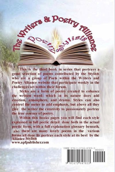 This is the third book in series that portrays a great selection of poems contributed by the Stylists a who are a group of Poets within the Writers Alliance Poetry website that participate weekly all the poetry styles. Styles are form of poetry created to enhance the written word; which can by nature add emotion, atmosphere, and drama. Styles can control the meter adding emphasis, but above all it gives the writer the creativity to passionately portray the true essence of poetry. Within the books pages you will find each style explained in full poetic detail done in the actual poetic form, plus a full explanation glossary beneath alongside lovely poems in many various themes by the 'Stylists' to be read, enjoyed and if a new style to you, learned from.