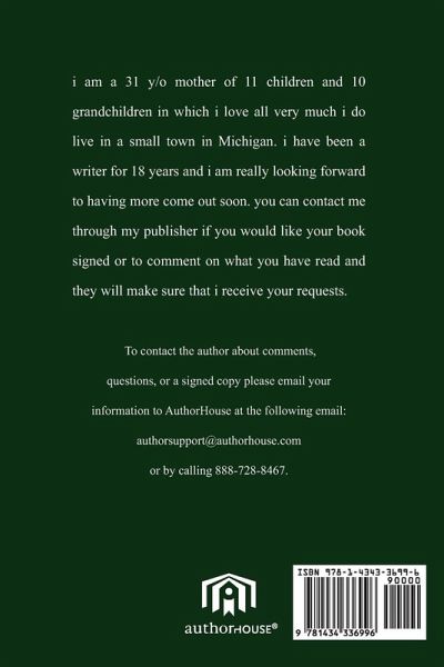 i am a 31 y/o mother of 11 children and 10 grandchildren in which i love all very much i do live in a small town in Michigan. i have been a writer for 18 years and i am really looking forward to having more come out soon. you can contact me through my publisher if you would like your book signed or to comment on what you have read and they will make sure that i receive your requests. (note to publisher) please put contact info here for them to get ahold of you then you can contact me letting me know their requests.