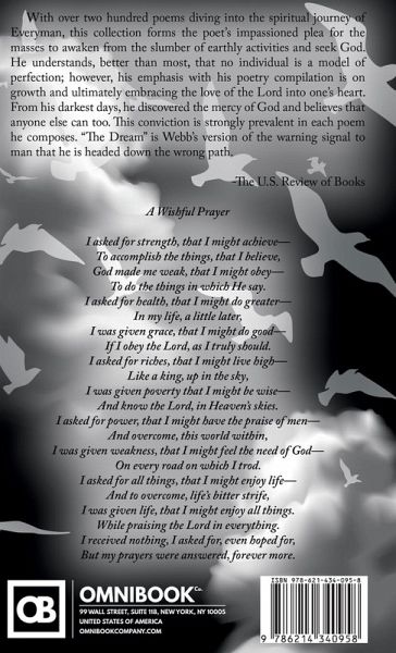 With over two hundred poems diving into the spiritual journey of every man, this collection forms the poet's plea for the masses to awaken from the slumber of earthly activities and seek God. He understands, better than most, that no individual is a model of perfection; however, his emphasis with his poetry compilation is on growth and ultimately embracing the love of the Lord into one's heart. From his darkest days, he discovered the mercy of God and believes that anyone else can too. This conviction is strongly prevalent in each poem he composes. "The Dream" is Webb's version of a warning signal to man that he is headed down the wrong path. -The U.S. Review of Books