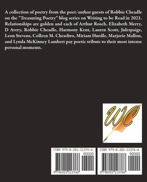 A collection of poetry from the poet/author guests of Robbie Cheadle on the "Treasuring Poetry" blog series on Writing to be Read in 2021. Relationships are golden and each of Arthur Rosch, Elizabeth Merry, D Avery, Robbie Cheadle, Harmony Kent, Lauren Scott, Julespaige, Leon Stevens, Colleen M. Chesebro, Miriam Hurdle, Marjorie Mallon, and Lynda McKinney Lambert pay poetic tribute to their most intense personal moments.