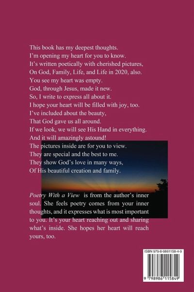 Poetry With a View is lifelong collection of seventy-seven poems about God, Family, Life, and Life in 2020. It includes photographs taken by the author to compliment the poems. It is filled with deep heartfelt and sentimental thoughts, as well as one's that are fun and carefree. They are all written from the author's perspective while seeking to understand life with God.