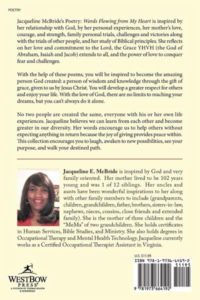 Jacqueline McBride's Poetry: Words Flowing from My Heart is inspired by her relationship with God, by her personal experiences, her mother's love, courage, and strength, family personal trials, challenges and victories along with the trials of other people, and her study of Biblical principles. She reflects on her love and commitment to the Lord, the Grace YHVH (the God of Abraham, Isaiah and Jacob) extends to all, and the power of love to conquer fear and challenges. With the help of these poems, you will be inspired to become the amazing person God created: a person of wisdom and knowledge through the gift of grace, given to us by Jesus Christ. You will develop a greater respect for others and enjoy your life. With the love of God, there are no limits to reaching your dreams, but you can't always do it alone. No two people are created the same, everyone with his or her own life experiences. Jacqueline believes we can learn from each other and become greater in our diversity. Her words encourage us to help others without expecting anything in return because the joy of giving provides peace within. This collection encourages you to laugh, awaken to new possibilities, see your purpose, and walk your destined path.