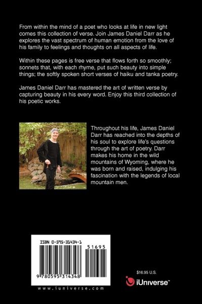 From within the mind of a poet who looks at life in new light comes this collection of verse. Join James Daniel Darr as he explores the vast spectrum of human emotion from the love of his family to feelings and thoughts on all aspects of life. Within these pages is free verse that flows forth so smoothly; sonnets that, with each rhyme, put such beauty into simple things; the softly spoken short verses of haiku and tanka poetry. James Daniel Darr has mastered the art of written verse by capturing beauty in his every word. Enjoy this third collection of his poetic works.