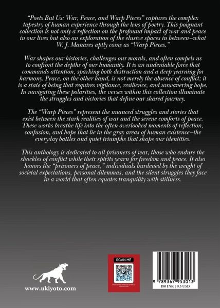 "Poets But Us: War, Peace, and Warp Pieces" captures the complex tapestry of human experience through the lens of poetry. This poignant collection is not only a reflection on the profound impact of war and peace in our lives but also an exploration of the elusive spaces in between-what W. J. Manares aptly coins as "Warp Pieces." War shapes our histories, challenges our morals, and often compels us to confront the depths of our humanity. It is an undeniable force that commands attention, sparking both destruction and a deep yearning for harmony. Peace, on the other hand, is not merely the absence of conflict; it is a state of being that requires vigilance, resilience, and unwavering hope. In navigating these polarities, the verses within this collection illuminate the struggles and victories that define our shared journey. The "Warp Pieces" represent the nuanced struggles and stories that exist between the stark realities of war and the serene comforts of peace. These works breathe life into the often overlooked moments of reflection, confusion, and hope that lie in the gray areas of human existence-the everyday battles and quiet triumphs that shape our identities. This anthology is dedicated to all prisoners of war, those who endure the shackles of conflict while their spirits yearn for freedom and peace. It also honors the "prisoners of peace," individuals burdened by the weight of societal expectations, personal dilemmas, and the silent struggles they face in a world that often equates tranquility with stillness