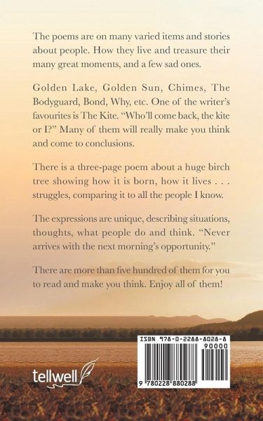 The poems are on many varied items and stories about people. How they live and treasure their many great moments, and a few sad ones. Golden Lake, Golden Sun, Chimes, The Bodyguard, Bond, Why, etc. One of the writer's favourites is The Kite. "Who'll come back, the kite or I?" Many of them will really make you think and come to conclusions. There is a three-page poem about a huge birch tree showing how it is born, how it lives . . . struggles, comparing it to all the people I know. The expressions are unique, describing situations, thoughts, what people do and think. "Never arrives with the next morning's opportunity." There are more than five hundred of them for you to read and make you think. Enjoy all of them!