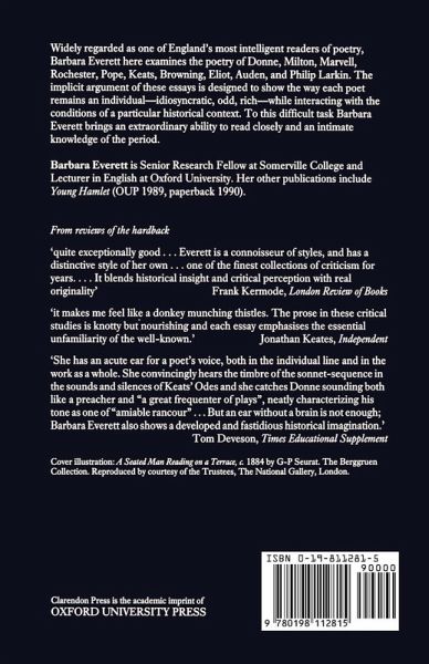 In Poets in their Time Barbara Everett brings her extraordinary ability to read closely and her intimate knowledge of the period to an examination of Donne, Milton, Marvell, Rochester, Pope, Keats, Browning, Eliot, Auden, and Philip Larkin. The implicit argument of these twelve essays is designed to show the way each poet remains an individual while interacting with the conditions of a particular historical context. `quite exceptionally good ... one of the finest collections of criticism for years ... It blends historical insight and critical perception with real originality' Frank Kermode, London Review of Books `She has an acute ear for a poet's voice, both in the individual life and in the work as a whole. She convincingly hears the timbre of the sonnet-sequence in the sounds and silences of Keats' Odes and she catches Donne sounding both like a preacher and "a great frequenter of plays", neatly characterizing his tone as one of "amiable rancour" ... But an ear without a brain is not enough. Barbara Everett also shows a developed and fastidious historical imagination.' Tim Deveson, Times Educational Supplement `it makes me feel like a donkey munching thistles. The prose in these critical studies is knotty but nourishing and each essay emphasises the essential unfamiliarity of the well known. Jonathan Keats, Independent `the kind of thoughtful appreciation is that Donne, among others, would agree was worth waiting a few hundred years for.' Clive James, Observer