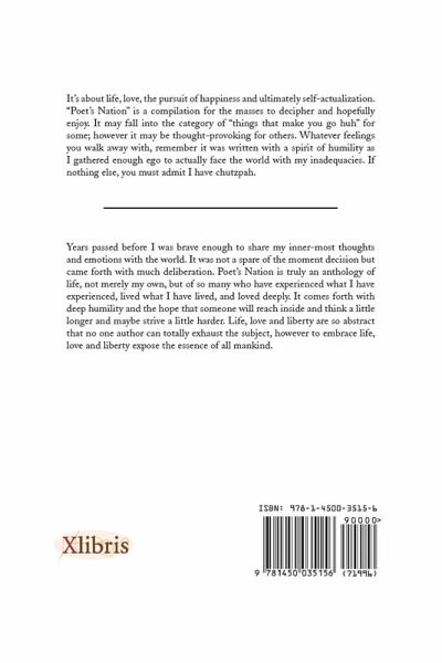 It's about life, love, the pursuit of happiness and ultimately self-actualization. "Poet's Nation" is a compilation for the masses to decipher and hopefully enjoy. It may fall into the category of "things that make you go huh" for some; however it may be thought-provoking for others. Whatever feelings you walk away with, remember it was written with a spirit of humility as I gathered enough ego to actually face the world with my inadequacies. If nothing else, you must admit I have chutzpah.