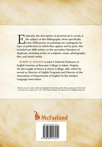 Ekphrasis, the description of pictorial art in words, is the subject of this bibliography. More specifically, some 2500 poems on paintings are catalogued, by type of publication in which they appear and by poet. Also included are 2000 entries on the secondary literature of ekphrasis, including works on sculpture, music, photography, film, and mixed media.