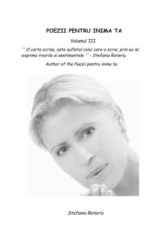 'POEZII PENTRU INIMA TA'' Volumul III: ''O carte scrisa, este sufletul celui care-o scrie; prin ea isi exprima trairile si sentimentele.''- Stefania Rotariu Author of the'' Poezii pentru inima ta'' Volumul III. Biography In Iunie 2010 am inceput scrierea primului volum ''POEZII PENTRU INIMA TA '' si in 2012 septembrie a fost publicat in America, apoi am scris in continuare al doilea si alt treilea volum de poezii pe care le-am pregatit pentru publicare in Londra si in acelasi timp a incoltit gandul pentru versiunea in limba engleza , sperand sa duc la capat acest proiect pana in anul 2015.