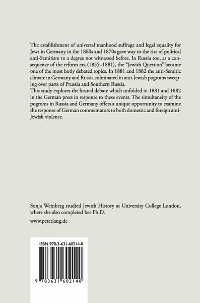 The establishment of universal manhood suffrage and legal equality for Jews in Germany in the 1860s and 1870s gave way to the rise of political anti-Semitism to a degree not witnessed before. In Russia too, as a consequence of the reform era (1855-1881), the "Jewish Question" became one of the most hotly debated topics. In 1881 and 1882 the anti-Semitic climate in Germany and Russia culminated in anti-Jewish pogroms sweeping over parts of Prussia and Southern Russia. This study explores the heated debate which unfolded in 1881 and 1882 in the German press in response to these events. The simultaneity of the pogroms in Russia and Germany offers a unique opportunity to examine the response of German commentators to both domestic and foreign anti-Jewish violence.