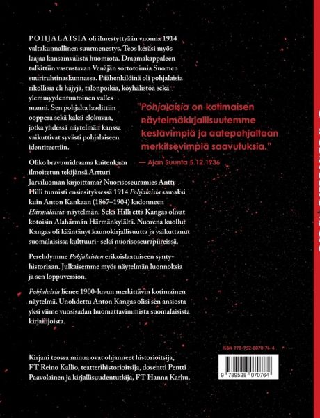 * Pohjalaisia on kotimaisen näytelmäkirjallisuutemme kestävimpiä ja aatepohjaltaan merkitsevimpiä saavutuksia. - Ajan Suunta 5.12.1936. * Näytelmä on tapahtumiltaan paikallinen, mutta teemoiltaan universaali. - Kirjallisuudentutkijat Markku Kulmala ja Anssi Orrenmaa, teoksessaan Sanoilla Rakennettu 2023. * On varsin vakuuttavasti esitetty, että Pohjalaisia ei olisikaan alun perin Järviluoman oma teksti, vaan pohjalaisen kansankirjoittajan. - teatterihistorioitsija Pentti Paavolainen, Suomen teatterihistoria 2016. Pohjalaisia oli ilmestyttyään 1914 valtakunnallinen suurmenestys. Teos keräsi myös laajaa kansainvälistä huomiota. Draamakappaleen tulkittiin vastustavan Venäjän sortotoimia Suomen suuriruhtinaskunnassa. Päähenkilöinä oli pohjalaisia rikollisia eli häjyjä, talonpoikia, köyhälistöä sekä ylemmyydentuntoinen vallesmanni. Sen pohjalta laadittiin ooppera sekä kaksi elokuvaa, jotka yhdessä näytelmän kanssa vaikuttivat syvästi pohjalaiseen identiteettiin. Oliko bravuuridraama kuitenkaan ilmoitetun tekijänsä Artturi Järviluoman kirjoittama? Nuorisoseuramies Antti Hilli tunnisti ensiesityksessä 1914 Pohjalaisia samaksi kuin Anton Kankaan (1867-1904) kadonneen Härmäläisiä-näytelmän. Sekä Hilli että Kangas olivat kotoisin Alahärmän Härmänkylältä. Nuorena kuollut Kangas oli kääntänyt kaunokirjallisuutta ja vaikuttanut suomalaisissa kulttuuri- ja nuorisoseurapiireissä. Perehdymme Pohjalaisten erikoislaatuiseen syntyhistoriaan. Julkaisemme myös näytelmän luonnoksia ja sen loppuversion. Pohjalaisia lienee 1900-luvun merkittävin kotimainen näytelmä. Unohdettu Anton Kangas olisi sen ansiosta yksi viime vuosisadan huomattavimmista suomalaisista kirjailijoista. Kirjani teossa minua ovat ohjanneet historioitsija FT Reino Kallio, teatterihistorioitsija, dosentti Pentti Paavolainen ja kirjallisuudentutkija, FT Hanna Karhu.