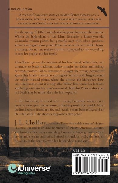 It is the spring of 186O, and a battle for power looms on the horizon. Within the high plains of the Llano Estacado, a fifteen-year-old Comanche woman pesters her powerful aunt with taboo questions about how to gain spirit power. Pohoi knows a time of terrible change is coming. But no one realizes that she is prepared to risk everything to save her people and her family. After Pohoi ignores the concerns of her best friend, Yellow Bear, and continues to break tradition, traders murder her father and kidnap her white mother. Pohoi, determined to right the wrongs committed against her family, transforms into a ghost warrior and charges toward the soldier-infested plains, where she believes the kidnappers have taken her mother. But it is only after Yellow Bear tracks her location and brings with him her aunt's unwanted child that Pohoi realizes her real battle may be in the place she least expected. In this fascinating historical tale, a young Comanche woman on a quest to earn spirit power learns a shocking truth that quickly blurs the line between friend and foe and reveals a route back to love and to life-but only if she chooses forgiveness over power.