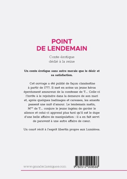 Un conte érotique sans autre morale que le désir et sa satisfaction. POUR UN PUBLIC AVERTI. Cet ouvrage a été publié de façon clandestine à partir de 1777. Il met en scène un jeune héros éperdument amoureux de la comtesse de T... Celle-ci l'invite à le rejoindre dans la demeure de son mari et, après quelques badinages et caresses, les amants passent une nuit d'amour. Le lendemain matin, Mme de T... conjure le jeune ingénu de garder le silence et celui-ci apprend plus tard qu'il est le dupe d'une belle affaire de manipulation : il a en fait servi de paravent à une autre affaire de c¿ur. Un court récit à l'esprit libertin propre aux Lumières. EXTRAIT J'aimais éperdument la comtesse de *** ; j¿avais vingt ans, et j¿étais ingénu ; elle me trompa ; je me fâchai ; elle me quitta. J¿étais ingénu, je la regrettai ; j¿avais vingt ans, elle me pardonna ; et comme j¿avais vingt ans, que j¿étais ingénu, toujours trompé, mais plus quitté, je me croyais l¿amant le mieux aimé, partant le plus heureux des hommes. Elle était amie de T..., qui semblait avoir quelques projets sur ma personne, mais sans que sa dignité fût compromise. Comme on le verra, madame de T... avait des principes de décence, auxquels elle était scrupuleusement attachée. Un jour que j¿allais attendre la comtesse dans sa loge, je m¿entends appeler de la loge voisine. N¿était-ce pas encore la décente madame de T... ? « Quoi ! Déjà ! me dit-on. Quel dés¿uvrement ! Venez donc près de moi » J¿étais loin de m¿attendre à tout ce que cette rencontre allait avoir de romanesque et d¿extraordinaire. On va vite avec l¿imagination des femmes, et dans ce moment, celle de madame de T... fut singulièrement inspirée. À PROPOS DE L'AUTEUR Dominique Vivant Denon (1747-1825) était un graveur, écrivain et diplomate français. Membre de l'Académie royale de peinture et de sculpture, il rassemble dans un recueil 23 estampes gravées au thème érotique, sous le titre OEuvre priapique. Point de lendemain est son unique texte littéraire. Fervent précurseur de l'égyptologie ¿ il accompagne Bonaparte dans la campagne d'Égypte ¿ et de la muséologie, Vivant Denon s'illustre notamment pour sa contribution à l'organisation du musée du Louvre. À PROPOS DE LA COLLECTION Retrouvez les plus grands noms de la littérature érotique dans notre collection Grands classiques érotiques. Autrefois poussés à la clandestinité et relégués dans « l'Enfer des bibliothèques », les auteurs de ces ¿uvres incontournables du genre sont aujourd'hui reconnus mondialement. Du Marquis de Sade à Alphonse Momas et ses multiples pseudonymes, en passant par le lyrique Alfred de Musset ou la féministe Renée Dunan, les Grands classiques érotiques proposent un catalogue complet et varié qui contentera tant les novices que les connaisseurs.