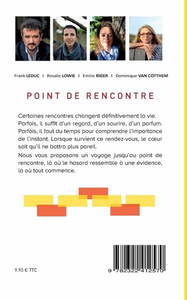 Certaines rencontres changent définitivement la vie. Parfois, il suffit d'un regard, d'un sourire, d'un parfum. Parois, il faut du temps pour comprendre l'importance de l'instant. Lorsque survient ce rendez-vous, le coeur sait qu'il ne battra plus pareil. Nous vous proposons un voyage jusqu'au point de rencontre, là où le hasard ressemble à une évidence, là où tout commence. Après "Quelques mots à vous dire" et "Un hôtel à Paris", "Point de rencontre" est le troisième recueil de nouvelles publié par Dominique Van Cotthen, Rosalie Lowie, Frank Leduc et Emilie Riger.