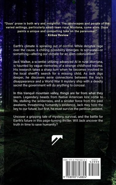Earth's climate is spiraling out of control. While debates rage over the cause, a chilling possibility emerges: Is someone-or something-altering our climate for an alien colonization? Jack Walker, a scientist utilizing advanced AI in rural Montana, is haunted by vague memories of a strange childhood trauma. His research takes a sharp turn when he becomes involved in the local sheriff's search for a missing child. As Jack digs deeper, he discovers eerie connections between the boy's disappearance and a World War II mystery ship with a deadly secret the government will do anything to conceal. In this tranquil mountain valley, things are far from what they seem. Legendary beasts from Native American lore come to life, stalking the wilderness, and a sinister force from the past awakens, threatening humanity's existence. Jack may hold the key to our future, but first, he must survive the perilous present. Uncover a gripping tale of mystery, survival, and the battle for Earth's future in this page-turning thriller. Will Jack uncover the truth in time to save humanity? "Duus' prose is both wry and insightful. The landscapes and people of the varied settings, particularly small-town rural Montana, come alive. Duus paints a unique and compelling take on the paranormal." - Kirkus Review