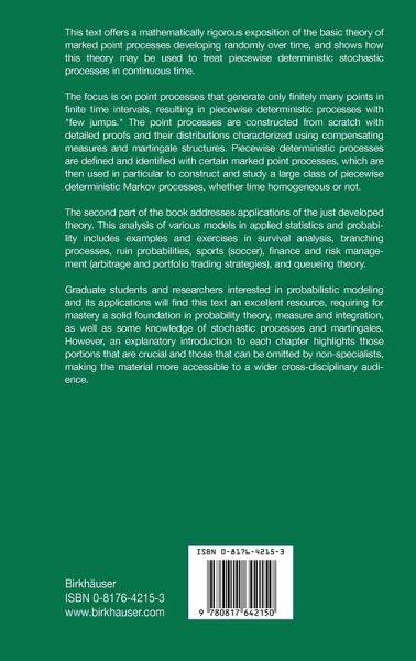 The book aims at presenting a detailed and mathematically rigorous exposition of the theory and applications of a class of point processes and piecewise deterministic p- cesses. The framework is suf?ciently general to unify the treatment of several classes of stochastic phenomena: point processes, Markov chains and other Markov processes in continuous time, semi-Markov processes, queueing and storage models, and li- lihood processes. There are applications to ?nance, insurance and risk, population models, survival analysis, and congestion models. A major aim has been to show the versatility of piecewise deterministic Markov processes for applications and to show how they may also become useful in areas where thus far they have not been much in evidence. Originally the plan was to develop a graduate text on marked point processes - dexed by time which would focus on probabilistic structure and be essentially se- contained. However, it soon became apparent that the discussion should naturally include a traditional class of continuous time stochastic processes constructed from certain marked point processes. This class consists of 'piecewise deterministic p- cesses'; that is, processes with ?nitely many jumps on ?nite time intervals which, roughly speaking, develop deterministically between the random jump times. The - position starts with the point process theory and then uses this to treat the piecewise deterministic processes.