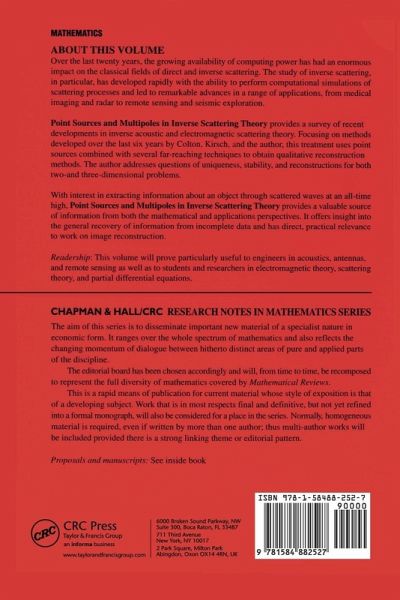 Over the last twenty years, the growing availability of computing power has had an enormous impact on the classical fields of direct and inverse scattering. The study of inverse scattering, in particular, has developed rapidly with the ability to perform computational simulations of scattering processes and led to remarkable advances in a range of applications, from medical imaging and radar to remote sensing and seismic exploration. Point Sources and Multipoles in Inverse Scattering Theory provides a survey of recent developments in inverse acoustic and electromagnetic scattering theory. Focusing on methods developed over the last six years by Colton, Kirsch, and the author, this treatment uses point sources combined with several far-reaching techniques to obtain qualitative reconstruction methods. The author addresses questions of uniqueness, stability, and reconstructions for both two-and three-dimensional problems. With interest in extracting information about an object through scattered waves at an all-time high, Point Sources and Multipoles in Inverse Scattering Theory provides a valuable source of information from both the mathematical and applications perspectives. It offers insight into the general recovery of information from incomplete data and has direct, practical relevance to work on image reconstruction.
