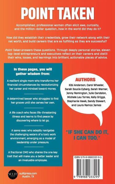 "Point Taken is a powerful read for every human who is ready to release themselves from boxed thinking around how to live and and how to be fulfilled in everyday life. If you're overworked, self- sabotaging, feeling emotionally burdened or isolated from your tribe, this book will remind you that your greatest potential is arising!" -Sybil Clark-Amuti, CEO and Host of The Great Girlfriends Show¿¿ Accomplished, professional women often elicit awe, curiosity, and the million-dollar question...how in the world did they do it? How did they establish their credentials, grow their network along with their net worth, and build careers that are as fulfilling as they are successful? Point Taken answers these questions. Through deeply personal stories, eleven top-level female entrepreneurs and executives reflect on their careers and distill their wins, losses, and learnings into brilliant, actionable pieces of advice. In these pages, you'll gather wisdom from: A resilient single mom who transforms her financial circumstances by revolutionizing her career and mindset toward money. A determined lawyer who struggles to find her groove until she carves her own A life coach who faces life-threatening illness and learns to find peace by discovering where to let go. A savvy exec who adeptly navigates the challenging waters of a toxic work environment, emerging as a model of leadership under pressure. A fractional CMO who shares the one key trait that will make you a better leader and an invaluable employee. Kibi Anderson, Carol Wheeler, Sarah Soucie Eyberg, Sarah Warner, Jenny Remington, Julie Candelon, Michele Lau Torres, Kelly Griggs, Stephanie Hawk, Sandy Stewart, and Laura Ramos James share their formative experiences and the practical strategies that propelled them to the top of their fields. With their diverse experiences and unique perspectives, these women in business provide a roadmap for anyone looking to navigate the complexities of career advancement and personal growth. These awe-inspiring essays will have you chanting, "If she can do it, I can too!"