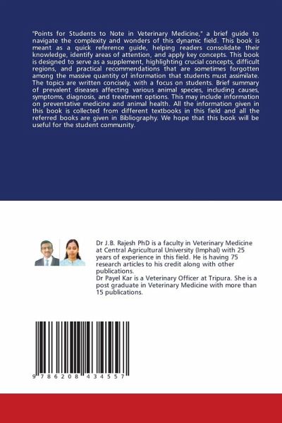 "Points for Students to Note in Veterinary Medicine," a brief guide to navigate the complexity and wonders of this dynamic field. This book is meant as a quick reference guide, helping readers consolidate their knowledge, identify areas of attention, and apply key concepts. This book is designed to serve as a supplement, highlighting crucial concepts, difficult regions, and practical recommendations that are sometimes forgotten among the massive quantity of information that students must assimilate. The topics are written concisely, with a focus on students. Brief summary of prevalent diseases affecting various animal species, including causes, symptoms, diagnosis, and treatment options. This may include information on preventative medicine and animal health. All the information given in this book is collected from different textbooks in this field and all the referred books are given in Bibliography. We hope that this book will be useful for the student community.