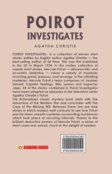 POIROT INVESTIGATES:- is a collection of eleven short stories written by English author Agatha Christie ? the best-selling author of all time. This was first published in the UK in March 1924. In the motley collection of superb short stories, Hercule Poirot ? idiosyncratic and eccentric detective ? solves a variety of mysteries involving greed, jealousy, and revenge. In the unfolding mysteries, Hercule Poirot?s team comprises of, besides himself, Captain Hastings, Miss Lemon and Inspector Japp. All of the stories contained in Poirot Investigates have been adapted as episodes in the television series Agatha Christie?s Poirot. The fictionalized classic mystery book starts with The Adventure of the Western Star and concludes with The Case of the Missing Will. Between these two are nine stories in which readers wait curiously to see how Poirot and his team unearth mysteries surrounding incidences which took place at recurring intervals. Thanks to the brilliant deductive powers of Hercule Poirot, a series of short cases was solved, much to the delight of readers.