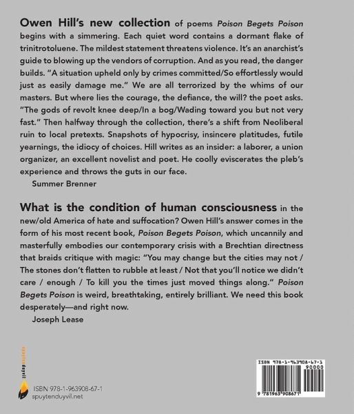 What is the condition of human consciousness in the new/old America of hate and suffocation? Owen Hill's answer comes in the form of his most recent book, Poison Begets Poison, which uncannily and masterfully embodies our contemporary crisis with a Brechtian directness that braids critique with magic.