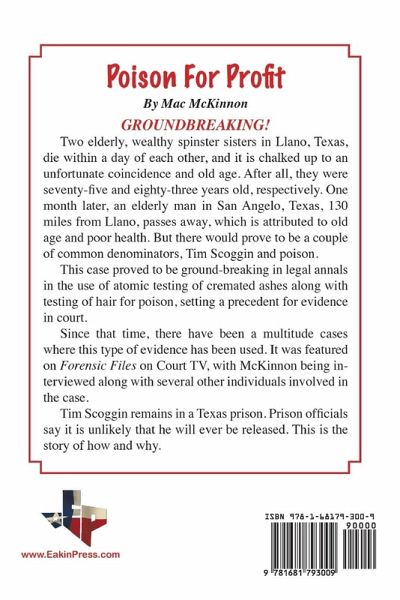 GROUNDBREAKING! Two elderly, wealthy spinster sisters in Llano, Texas, die within a day of each other, and it is chalked up to an unfortunate coincidence and old age. After all, they were seventy-five and eighty-three years old, respectively. One month later, an elderly man in San Angelo, Texas, 130 miles from Llano passes away, and it is attributed to old age and poor health. But there would prove to be a couple of common denominators, Tim Scoggin and poison. This case proved to be ground-breaking in legal annals in the use of atomic testing of cremated ashes along with testing of hair for…mehr