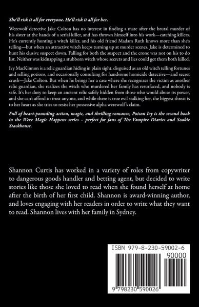 She'll risk it all for everyone. He'll risk it all for her. Werewolf detective Jake Colton has no interest in finding a mate after the brutal murder of his sister at the hands of a serial killer, and has thrown himself into his work-catching killers. He's currently hunting a witch killer, and his old friend Madam Ruth knows more than she's telling-but when an attractive witch keeps turning up at murder scenes, Jake is determined to hunt his elusive suspect down. Falling for both the suspect and the crone was not on his to do list. Neither was kidnapping a stubborn witch whose secrets and lies could get them both killed. Ivy MacKinnon is a relic guardian hiding in plain sight, disguised as an old witch telling fortunes and selling potions, and occasionally consulting for handsome homicide detective-and secret crush-Jake Colton. But when he brings her a case where she recognizes the victim as another relic guardian, she realizes the witch who murdered her family has resurfaced, and nobody is safe. It's her duty to keep an ancient relic safely hidden from those who would abuse its power, and she can't afford to trust anyone, and while there is true evil stalking her, the biggest threat is to her heart as she tries to resist her possessive alpha werewolf's claim. Full of heart-pounding action, magic, and thrilling romance, Poison Ivy is the second book in the Were Magic Happens series - perfect for fans of The Vampire Diaries and Sookie Stackhouse.