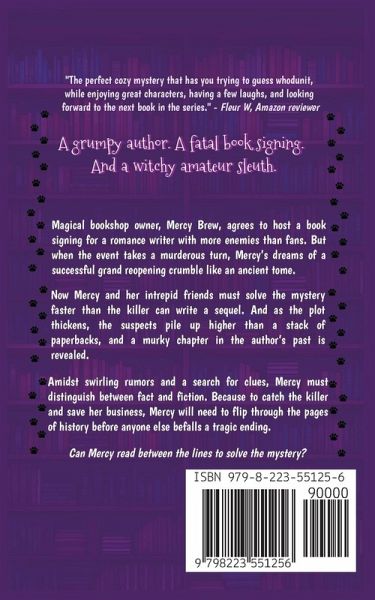 A grumpy author. A fatal book signing. And a witchy amateur sleuth. Magical bookshop owner, Mercy Brew, agrees to host a book signing for a romance writer with more enemies than fans. But when the event takes a murderous turn, Mercy's dreams of a successful grand reopening crumble like an ancient tome. Now Mercy and her intrepid friends must solve the mystery faster than the killer can write a sequel. And as the plot thickens, the suspects pile up higher than a stack of paperbacks, and a murky chapter in the author's past is revealed. Amidst swirling rumors and a search for clues, Mercy must distinguish between fact and fiction. Because to catch the killer and save her business, Mercy will need to flip through the pages of history before anyone else befalls a tragic ending. Can Mercy read between the lines to solve the mystery?