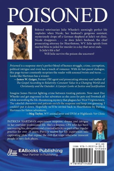 Ten years ago, Julie Wheeler embarked on a dream when she moved to Hearthstone, West Virginia. She purchased her own veterinary practice, married Richard-the town's most eligible bachelor and chief prosecuting attorney-and was lulled into marital bliss. But when Nicole, her husband's assistant, mysteriously drops off her poisoned German Shepherd and disappears, the questions start. Where is Richard? Is he with Nicole? Why has Richard been coming home late all the time? Had she been too busy to notice? As Julie raises her head from the ostrich hole, she realizes the world as she knew it has been disappearing as a poison has been eating away at her life. Sheriff Mack, their close friend, is despondent. His office is filled with unfamiliar faces including one particularly creepy Deputy Cruz who seems to be following her . . . and dating Julie's sister who is recovering from yet another failed relationship. And Jake, the new farmhand her husband hired two months ago. Up until now, she has hardly seen him, but on this day, he's everywhere. Julie's desperate search for the truth lands her in jail accused of murder-which turns out to be the least of her problems. What is going on in Hearthstone? Is her husband faithful? Is he alive? Will Julie survive? This first book in the West Virginia Series delivers an intensely packed thirty-six hours of suspense, drama, crime, family troubles, twists, and turns that keep readers turning pages to find the source of the poison that threatens Julie's very life.