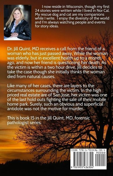 Dr. Jill Quint, MD receives a call from the friend of a woman who has just passed away. While the woman was elderly and in excellent health up to a month ago, now her friend was questioning her death. As the victim is within a two hour drive, Jill decides to take the case though she initially thinks the woman dies from natural causes. Like many of her cases, there are layers to the circumstances surrounding the victim. In the high priced real estate are of San Jose, her victim was one of the last hold outs fighting the sale of their mobile home park. Surely, such an obvious and superficial antidote was not the motive for murder. This is book 15 in the Jill Quint, MD, forensic pathologist series.