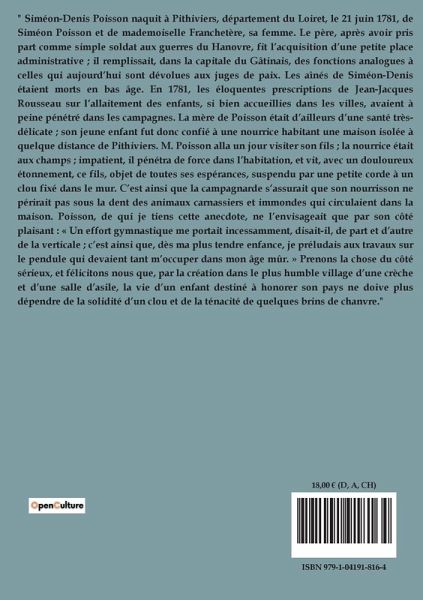 " Siméon-Denis Poisson naquit à Pithiviers, département du Loiret, le 21 juin 1781, de Siméon Poisson et de mademoiselle Franchetère, sa femme. Le père, après avoir pris part comme simple soldat aux guerres du Hanovre, fit l¿acquisition d¿une petite place administrative ; il remplissait, dans la capitale du Gâtinais, des fonctions analogues à celles qui aujourd¿hui sont dévolues aux juges de paix. Les aînés de Siméon-Denis étaient morts en bas âge. En 1781, les éloquentes prescriptions de Jean-Jacques Rousseau sur l¿allaitement des enfants, si bien accueillies dans les villes, avaient à peine pénétré dans les campagnes. La mère de Poisson était d¿ailleurs d¿une santé très- délicate ; son jeune enfant fut donc confié à une nourrice habitant une maison isolée à quelque distance de Pithiviers. M. Poisson alla un jour visiter son fils ; la nourrice était aux champs ; impatient, il pénétra de force dans l¿habitation, et vit, avec un douloureux étonnement, ce fils, objet de toutes ses espérances, suspendu par une petite corde à un clou fixé dans le mur. C¿est ainsi que la campagnarde s¿assurait que son nourrisson ne périrait pas sous la dent des animaux carnassiers et immondes qui circulaient dans la maison. Poisson, de qui je tiens cette anecdote, ne l¿envisageait que par son côté plaisant : « Un effort gymnastique me portait incessamment, disait-il, de part et d¿autre de la verticale ; c¿est ainsi que, dès ma plus tendre enfance, je préludais aux travaux sur le pendule qui devaient tant m¿occuper dans mon âge mûr. » Prenons la chose du côté sérieux, et félicitons nous que, par la création dans le plus humble village d¿une crèche et d¿une salle d¿asile, la vie d¿un enfant destiné à honorer son pays ne doive plus dépendre de la solidité d¿un clou et de la ténacité de quelques brins de chanvre."