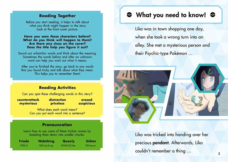 Join Liko, Roy and Dot on their next adventure in Paldea. This simple story book is accessible to young readers who are learning to read independently. The time has come for Dot to become an official Pokémon Trainer, so Friede gives her a Poké Ball - and after she throws it, Quaxly jumps right in! Now the trio of Liko, Roy, and Dot are determined to track down the person who stole Liko's pendant. Join this fun adventure in Paldea and find out what happens next. This Level 2 reader includes longer sentence structures, more challenging vocabulary, paragraphs and short chapter lengths. Also look out for these other Pokémon readers, featuring characters from the new Horizons TV series: * Pokémon Young Readers Level 1: Meet Sprigatito [9780008743130] * Pokémon Young Readers Level 1: Meet Fuecoco [9780008743154] * Pokémon Young Readers Level 2: Fuecoco the Berry Thief [9780008616762] * Pokémon Young Readers Level 2: Adventure on the Horizon [9780008680817] * Pokémon Young Readers Level 2: Special Training with Captain Pikachu [9780008743185] * Pokémon Young Readers Level 2: We Can Do It, Quaxly [9780008743192] * Pokémon Young Readers Level 3: Rivals in the Dark of Night [9780008743147] * Pokémon Young Readers Level 3: Roar of the Black Rayquaza [9780008743161] * Pokémon Young Readers Level 3: A Challenge from the Explorers [9780008743208] These readers are a fantastic introduction to reading, with simple text and pictures.