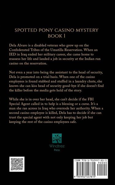 Spotted Pony Casino Mystery Book 1 Dela Alvaro is a disabled veteran who grew up on the Confederated Tribes of the Umatilla Reservation. When an IED in Iraq ended her military career, she came home to reassess her life and landed a job in security at the Indian run casino on the reservation. Not even a year into being the assistant to the head of security, Dela is promoted on a trial basis. When one of the casino employees is found stabbed and stuffed in a laundry chute, she knows she can kiss head of security good-bye if she doesn't find the killer before the media gets hold of the story. While she is in over her head, she can't decide if the FBI Special Agent called in to help is a blessing or a curse. It's a man she ran across in Iraq who overrode her authority. When a second casino employee is killed, Dela has to decide if she can trust the special agent with not only keeping her job but keeping the rest of the casino employees safe.