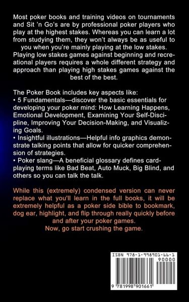 Most poker books and training videos on tournaments and Sit 'n Go's are by professional poker players who play at the highest stakes. Whereas you can learn a lot from studying them, they won't always be as useful to you when you're mainly playing at the low stakes. Playing low stakes games against beginning and recreational players requires a whole different strategy and approach than playing high stakes games against the best of the best. The Poker Book includes key aspects like:5 Fundamentals-discover the basic essentials for developing your poker mind: How Learning Happens, Emotional Development, Examining Your Self-Discipline, Improving Your Decision-Making, and Visualizing Goals. Insightful illustrations-Helpful info graphics demonstrate talking points that allow for quicker comprehension of strategies. Poker slang-A beneficial glossary defines card-playing terms like Bad Beat, Auto Muck, Big Blind, and others so you can talk the talk. While this (extremely) condensed version can never replace what you'll learn in the full books, it will be extremely helpful as a poker side bible to bookmark, dog ear, highlight, and flip through really quickly before and after your poker games. Now, go start crushing the game.