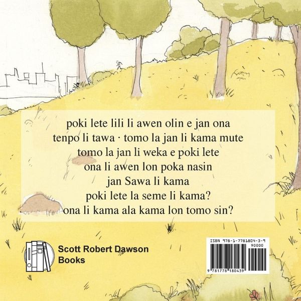 In a kind, green world, Little Fridge is abandoned by the side of the road. The mysterious Sarah finds him and together they set off on an adventure. Will Little Fridge find a new home? This Toki Pona children's story looks at the longing we all have to find a place of our own, where we are accepted and appreciated.