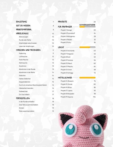 Schnapp dir deine Häkelnadel und erschaffe Masche für Masche deine liebsten Pokémon! Ob Pikachu, Evoli oder Bisasam - hier findest du detaillierte Schritt-für-Schritt-Anleitungen für 19 Pokémon-Figuren. Die illustrierten Grundlagen zu denbenötigten Häkeltechniken und die drei Schwierigkeitsstufen - für Anfänger, leicht und mittelschwer - garantieren Häkelspaß für alle Pokémon-Fans! Das große Häkelbuch enthält Anleitungen für Pikachu, Gengar, Pichu, Evoli, Mauzi, Enton, Glumanda, Schiggy, Bisasam und viele mehr.