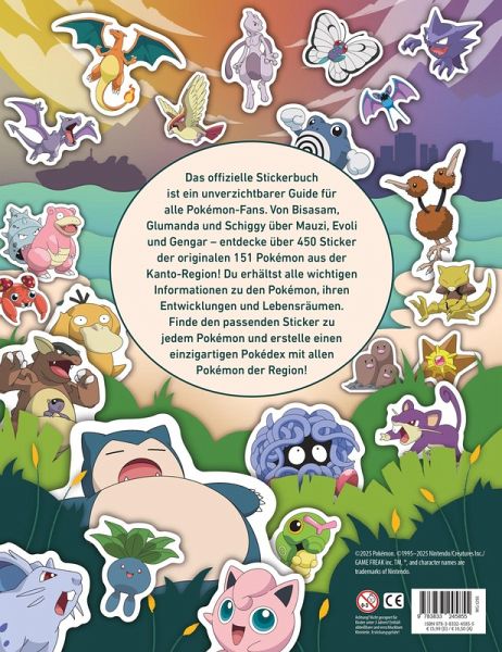 Das offizielle Stickerbuch ist ein unverzichtbarer Guide für alle Pokémon-Fans. Von Bisasam, Glumanda und Schiggy über Mauzi, Evoli und Gengar - entdecke über 450 Sticker der originalen 151 Pokémon aus der Kanto-Region! Du erhältst alle wichtigenInformationen zu den Pokémon, ihren Entwicklungen und Lebensräumen. Finde den passenden Sticker zu jedem Pokémon und erstelle einen einzigartigen Pokédex mit allen Pokémon der Region!