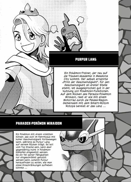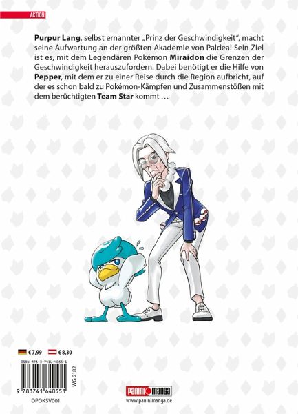 Purpur Lang, selbst ernannter "Prinz der Geschwindigkeit", macht seine Aufwartung an der größten Akademie von Paldea! Sein Ziel ist es, mit dem Legendären Pokémon Miraidon die Grenzen der Geschwindigkeit herauszufordern. Dabei benötigt er die Hilfe von Pepper, mit dem er zu einer Reise durch die Region aufbricht, auf der es schon bald zu Pokémon-Kämpfen und Zusammenstößen mit dem berüchtigten Team Star kommt...