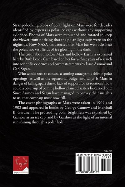 Strange-looking blobs of polar light on Mars were for decades identified by experts as polar ice caps without any supporting evidence. Photos of Mars were retouched and rotated to keep the viewer from noticing that the polar light-caps were on the nightside. Now NASA has detected that Mars has wet rocks near the poles, not vast fields of ice glowing in the dark. The truth about hollow Mars and hollow Earth is explained here by Ruth Leedy Carr, based on her forty-three years of research into scientific evidence and covert statements by Isaac Asimov and Carl Sagan. Who would seek to conceal a coming cataclysmic shift in polar openings, as well as the equatorial bulge, and why? Is Mars in danger of falling apart due to lack of support for its rotation? How could a cover-up of coming hollow planet disasters be carried out? Since Asimov and Sagan have managed to convey their insights to us, that cover-up must now fall. The cover photographs of Mars were taken in 1909 and 1902 and appeared in books by George Camow and Marshall B. Gardner. The protruding polar brightness was explained by Gamow as an ice cap, and by Gardner as the light of an internal sun shining through a polar hole.