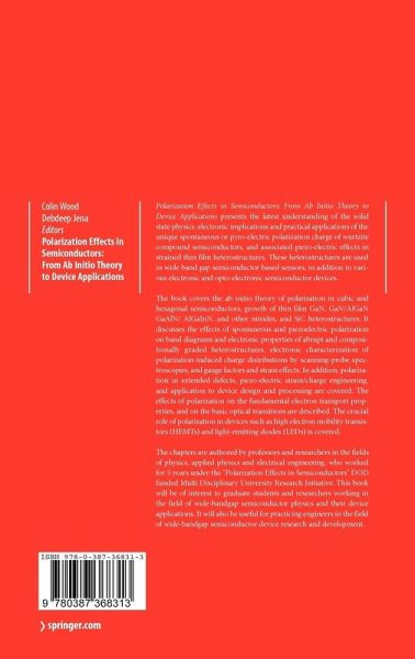The book covers the ab initio theory of polarization in cubic and hexagonal semiconductors, growth of thin film GaN, GaN/AlGaN GaAlN/ AlGaInN, and other nitrides, and SiC heterostructures. It discusses the effects of spontaneous and piezoelectric polarization on band diagrams and electronic properties of abrupt and compositionally graded heterostructures, electronic characterization of polarization-induced charge distributions by scanning-probe spectroscopies, and gauge factors and strain effects. In addition, polarization in extended defects, piezo-electric strain/charge engineering, and application to device design and processing are covered. The effects of polarization on the fundamental electron transport properties, and on the basic optical transitions are described. The crucial role of polarization in devices such as high electron mobility transistors (HEMTs) and light-emitting diodes (LEDs) is covered.