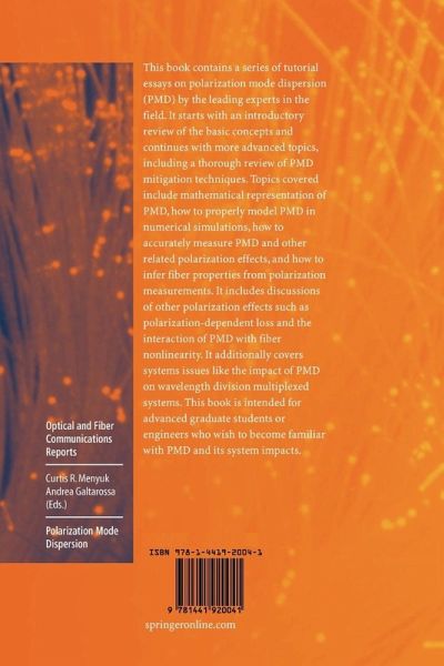This book contains a series of tutorial essays on polarization mode dispersion (PMD) by the leading experts in the field. It starts with an introductory review of the basic concepts and continues with more advanced topics, including a thorough review of PMD mitigation techniques. Topics covered include mathematical representation of PMD, how to properly model PMD in numerical simulations, how to accurately measure PMD and other related polarization effects, and how to infer fiber properties from polarization measurements. It includes discussions of other polarization effects such as polarization-dependent loss and the interaction of PMD with fiber nonlinearity. It additionally covers systems issues like the impact of PMD on wavelength division multiplexed systems. This book is intended for research scientists or engineers who wish to become familiar with PMD and its system impacts.