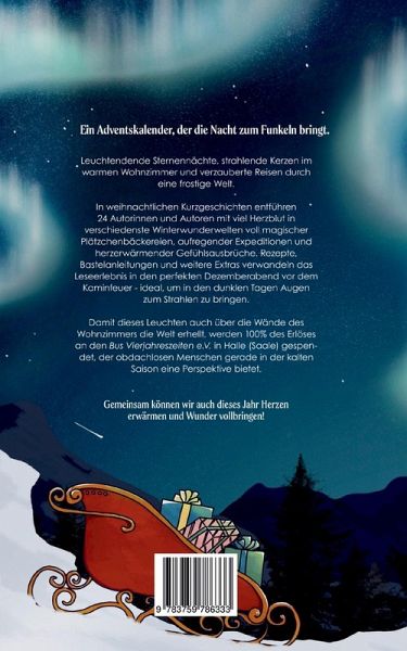 Ein Adventskalender, der die Nacht zum Funkeln bringt. Leuchtendende Sternennächte, strahlende Kerzen im warmen Wohnzimmer und verzauberte Reisen durch eine frostige Welt. In weihnachtlichen Kurzgeschichten entführen 24 Autorinnen und Autoren mit viel Herzblut in verschiedenste Winterwunderwelten voll magischer Plätzchenbäckereien, aufregender Expeditionen und herzerwärmender Gefühlsausbrüche. Rezepte, Bastelanleitungen und weitere Extras verwandeln das Leseerlebnis in den perfekten Dezemberabend vor dem Kaminfeuer - ideal, um in den dunklen Tagen Augen zum Strahlen zu bringen. Damit dieses Leuchten auch über die Wände des Wohnzimmers die Welt erhellt, werden 100% des Erlöses an den Bus Vierjahreszeiten e.V. in Halle (Saale) gespendet, der obdachlosen Menschen gerade in der kalten Saison eine Perspektive bietet. Gemeinsam können wir Herzen erwärmen und Wunder vollbringen!