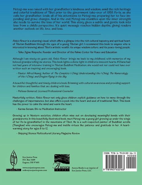 Award-Winning Finalist in the the 2019 International Book Awards. Winner of a 2018 Family Choice Award. Pola's Flower is a gentle yet powerful account of a young Tibetan girl's relationship with her grandfather, Pola. Metog-ma and Pola live in the quiet and magical land of Tibet during the time just before the historical government take-over. Pola is a painter of Buddhist scrolls known as thangkas. He tells Metog-ma that thangkas have the potential for giving secret messages to those who meditate on the sacred images. As a seven year old child growing up in a traditional family, Metog-ma recognizes her grandfather's capabilities for penetrating wisdom. And so, she follows Pola everywhere. She asks Pola everything. She listens closely to his words. And she watches as he paints grand landscapes adorned with glorious Buddhas, stately mountains, lush blue lakes, and richly colored lotus flowers. Secretly, she holds her greatest wish: to be able to see the messages hidden in her grandfather's beautiful paintings. With mastery, Pola prepares Metog-ma for impending and grave losses through his art. Sometimes this entails hard lessons, but she follows his every instruction even when faced with strong feelings of fear and sadness. Eventually, like one of Pola's lotus flowers growing out of the muck and mire, Metog-ma stumbles upon a wealth of inner strength and wisdom, aspiring to help others keep that which they love most alive in their hearts. Pola's Flower is absolutely lovely, illustrated by traditionally trained thangka artist, Lobsang Gyatso. Geared toward children of ages 9-12 years, it offers a respectful glimpse of Tibetan life at a time when their culture was untouched by the major historical changes. The story offers wonderful support for children facing major life changes, and provides adults the means to foster compassion and strength as they help their children deal with life experiences. Pola's Flower is a must-have!
