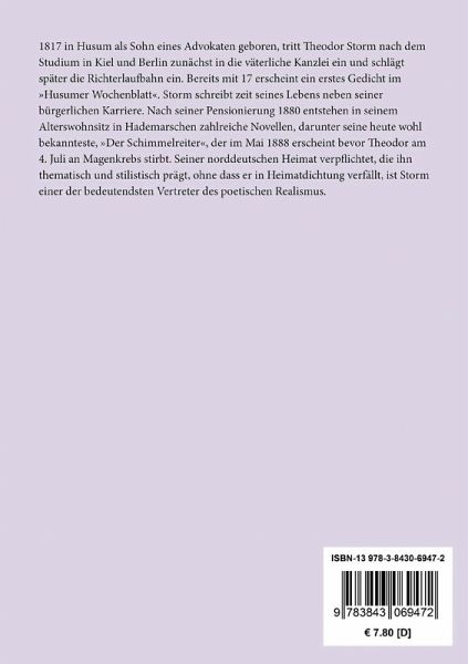 1817 in Husum als Sohn eines Advokaten geboren, tritt Theodor Storm nach dem Studium in Kiel und Berlin zunächst in die väterliche Kanzlei ein und schlägt später die Richterlaufbahn ein. Bereits mit 17 erscheint ein erstes Gedicht im "Husumer Wochenblatt". Storm schreibt zeit seines Lebens neben seiner bürgerlichen Karriere. Nach seiner Pensionierung 1880 entstehen in seinem Alterswohnsitz in Hademarschen zahlreiche Novellen, darunter seine heute wohl bekannteste, "Der Schimmelreiter", der im Mai 1888 erscheint bevor Theodor am 4. Juli an Magenkrebs stirbt. Seiner norddeutschen Heimat verpflichtet, die ihn thematisch und stilistisch prägt, ohne dass er in Heimatdichtung verfällt, ist Storm einer der bedeutendsten Vertreter des poetischen Realismus.