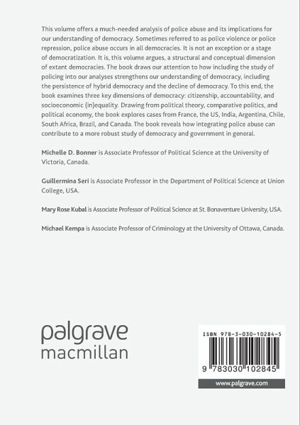 This volume offers a much-needed analysis of police abuse and its implications for our understanding of democracy. Sometimes referred to as police violence or police repression, police abuse occurs in all democracies. It is not an exception or a stage of democratization. It is, this volume argues, a structural and conceptual dimension of extant democracies. The book draws our attention to how including the study of policing into our analyses strengthens our understanding of democracy, including the persistence of hybrid democracy and the decline of democracy. To this end, the book examines three key dimensions of democracy: citizenship, accountability, and socioeconomic (in)equality. Drawing from political theory, comparative politics, and political economy, the book explores cases from France, the US, India, Argentina, Chile, South Africa, Brazil, and Canada, and reveals how integrating police abuse can contribute to a more robust study of democracy and government in general.