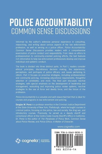 Informed by the author’s extensive personal experience in consulting, researching, and writing about various aspects of the law enforcement profession, as well as serving as a police officer, Police Accountability: Common Sense Discussions provides readers with a comprehensive examination of police conduct and responsibility. From ideas on ethics to professionalism to community-oriented policing efforts, the text features rich information to help law enforcement professionals develop and improve individual and systemic conduct. The book is divided into three distinct parts. In Part I, readers consider ethical principles; discretionary decision making; the experiences, perceptions, and portrayals of police officers; and issues pertaining to reform. Part II focuses on proactive strategies, including professionalism and community policing, increasing educational requirements, thoughtful selection of candidates, and more. The final part discusses reactive strategies, with special emphasis on the development of leadership and management, evaluating and improving police review systems, reactive strategies to the use of force and deadly force, and the future of the profession. Police Accountability is a valuable and well-researched text that is ideal for courses and programs in law enforcement and policing. Douglas W. Perez is a professor emeritus in the Criminal Justice Department at the State University of New York, Plattsburgh, where he taught courses in criminal justice, focusing on the police, law and society, the drug war, and introductory courses. Previously, he served as a deputy sheriff and correctional officer at the Contra Costa County Sheriff’s Office in California. Dr. Perez is the author of The Paradoxes of Policy Work, Common Sense about Police Review, and Police Ethics: A Matter of Character.