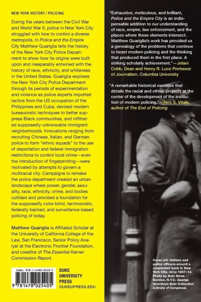 During the years between the Civil War and World War II, police in New York City struggled with how to control a diverse metropolis. In Police and the Empire City Matthew Guariglia tells the history of the New York Police Department to show how its origins were built upon and inseparably entwined with the history of race, ethnicity, and whiteness in the United States. Guariglia explores the New York City Police Department through its periods of experimentation and violence as police experts imported tactics from the US occupation of the Philippines and Cuba, devised modern bureaucratic techniques to better suppress Black communities, and infiltrated supposedly unknowable immigrant neighborhoods. Innovations ranging from recruiting Chinese, Italian, and German police to form "ethnic squads" to the use of deportation and federal immigration restrictions to control local crime-even the introduction of fingerprinting-were motivated by attempts to govern a multiracial city. Campaigns to remake the police department created an urban landscape where power, gender, sexuality, race, ethnicity, crime, and bodies collided and provided a foundation for the supposedly color-blind, technocratic, federally backed, and surveillance-based policing of today.