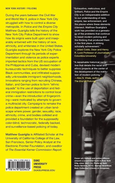 During the years between the Civil War and World War II, police in New York City struggled with how to control a diverse metropolis. In Police and the Empire City Matthew Guariglia tells the history of the New York Police Department to show how its origins were built upon and inseparably entwined with the history of race, ethnicity, and whiteness in the United States. Guariglia explores the New York City Police Department through its periods of experimentation and violence as police experts imported tactics from the US occupation of the Philippines and Cuba, devised modern bureaucratic techniques to better suppress Black communities, and infiltrated supposedly unknowable immigrant neighborhoods. Innovations ranging from recruiting Chinese, Italian, and German police to form "ethnic squads" to the use of deportation and federal immigration restrictions to control local crime-even the introduction of fingerprinting-were motivated by attempts to govern a multiracial city. Campaigns to remake the police department created an urban landscape where power, gender, sexuality, race, ethnicity, crime, and bodies collided and provided a foundation for the supposedly color-blind, technocratic, federally backed, and surveillance-based policing of today.